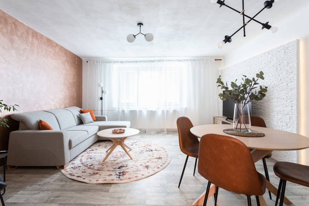 A réz szín lett az egész enteriőr összekötő eleme, ami a nappali falán dominál leginkább. A tervezők ezzel megalapozták a színpalettát, amit neutrális és tompa színekkel egészítettek ki.