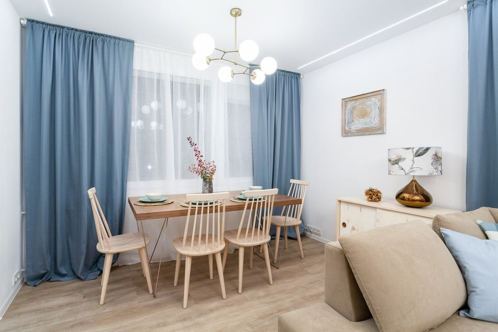 A sarokban egy bárasztalt helyeztek el egy rusztikus zsámollyal. De egy nagyobb összejövetel esetén a család értékelni fogja a minimalista talapzaton álló ebédlőasztalt, ami köré a tervezők négy széket tettek. A fehér és türkizkék edények hozzájárultak az egységes benyomáshoz.