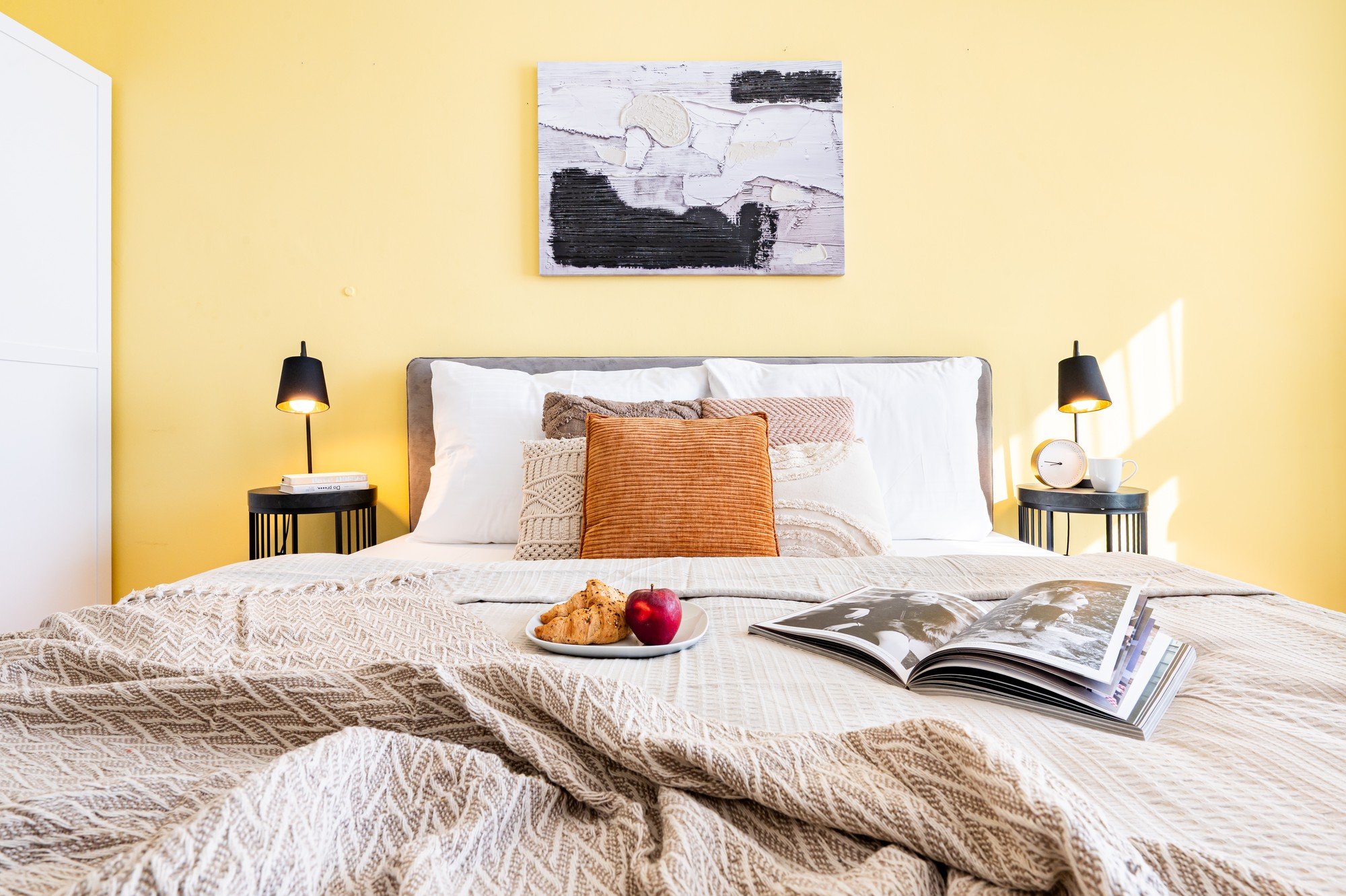 A rövid távú bérbeadásra szánt lakás átalakításának célja egy funkcionális, otthonos és egységes enteriőr létrehozása volt. A színek kulcsszerepet játszottak: összekötötték a meglévő és az új elemeket, karaktert adva a térnek. A hálószoba markáns falfestése harmonikusan illeszkedik az összképbe, erősítve az otthonos hangulatot.