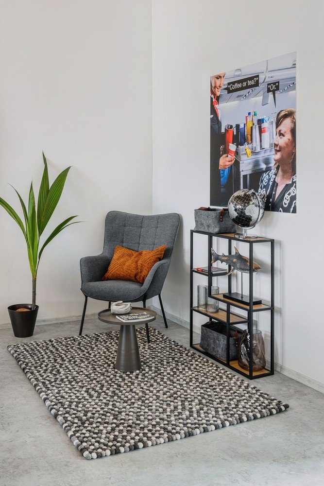 A vezérelvünk az volt, hogy megőrizzük a stúdió ipari jellegét. Ezért jelen kellett lenniük a stílus jellegzetes elemeinek, mint például a fekete fémnek és a patinának. Ezt a választott fában, és a sarokkanapé színében is figyelembe vettük. Mivel a falakra a grafikus alkotásai kerültek, a színpalettát úgy választottuk ki, hogy a bútorok ne hívják fel magukra a figyelmet.