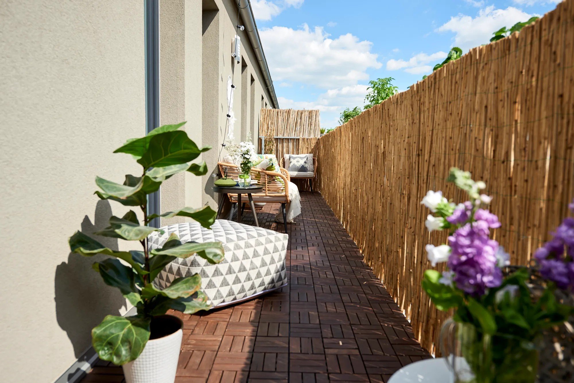 Hosszú, keskeny erkélyen jól működik, ha a bútorokat a fal mentén helyezed el – így az átjárás szabad marad, és a tér tágasabbnak hat.