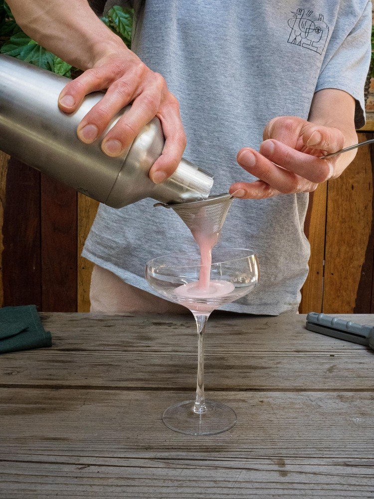 Sűrítsük át egy finom szűrőn keresztül egy rövid koktélpohárba, például egy pezsgőspohárba.