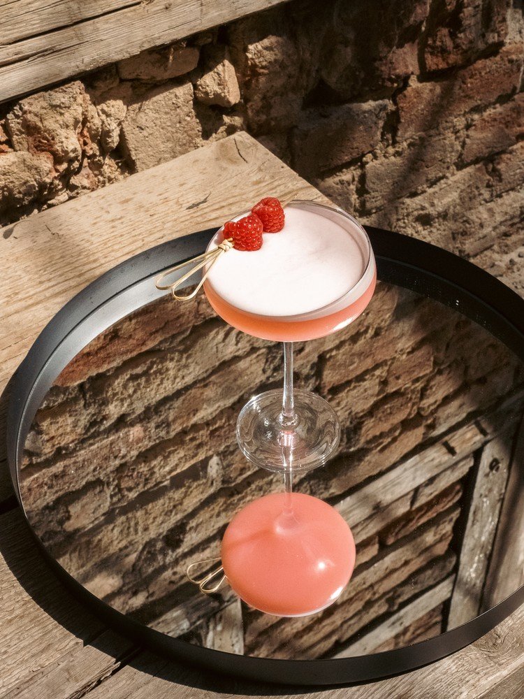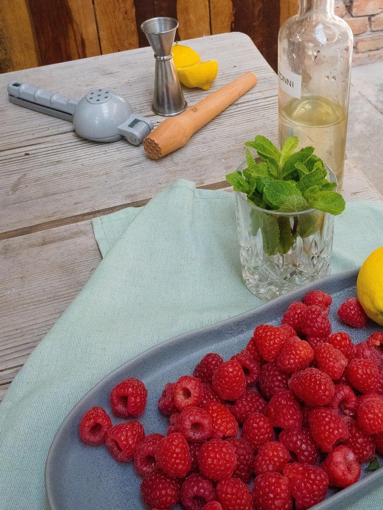 Végül felnyársalunk két-három friss málnát egy koktélnyársra, és a pohár fölé helyezzük.