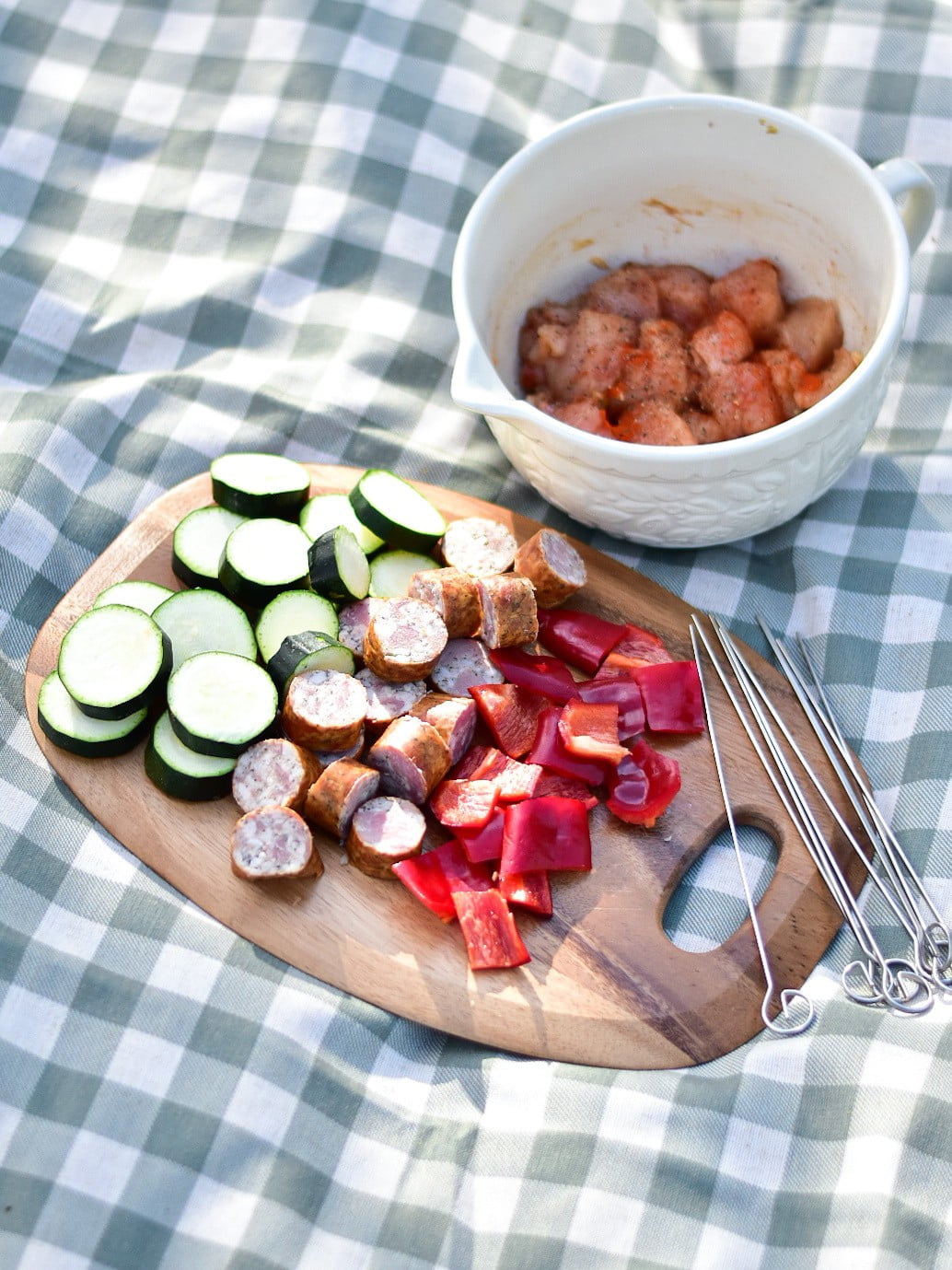 5. Felváltva szúrd a nyársra a csirke-, a zöldség- és a kolbászdarabokat.
