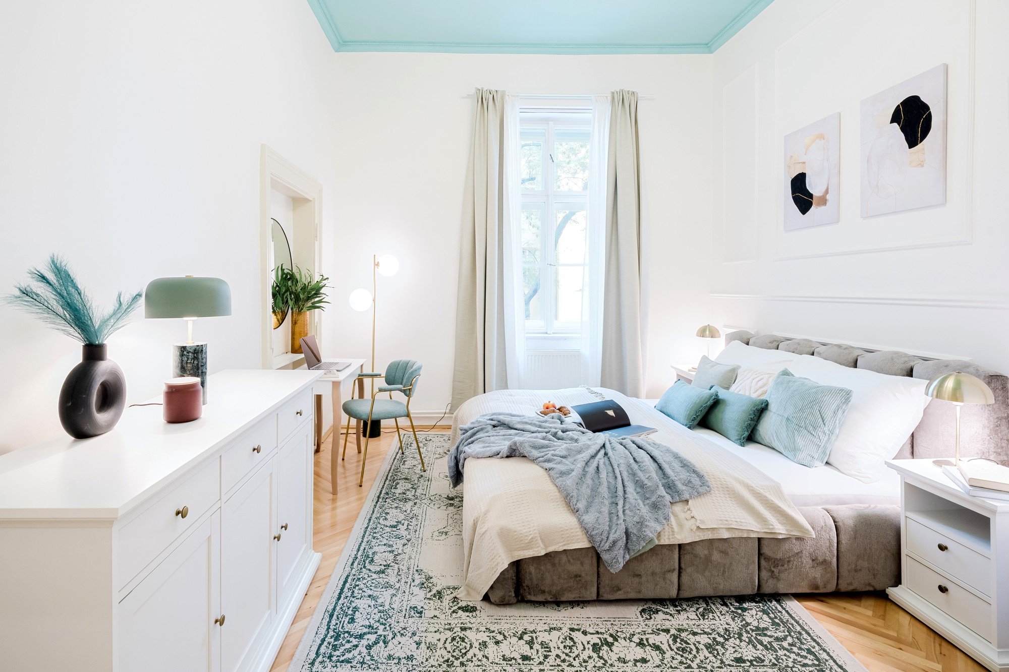Egy klasszikus prágai épület nagy belmagasságú, újonnan átalakított, háromszobás lakásába tehetsz most bepillantást. Fedezd fel a színesre festett mennyezetek, valamint a glamour elemek és arany részletek elegáns, karakteres összhatását!