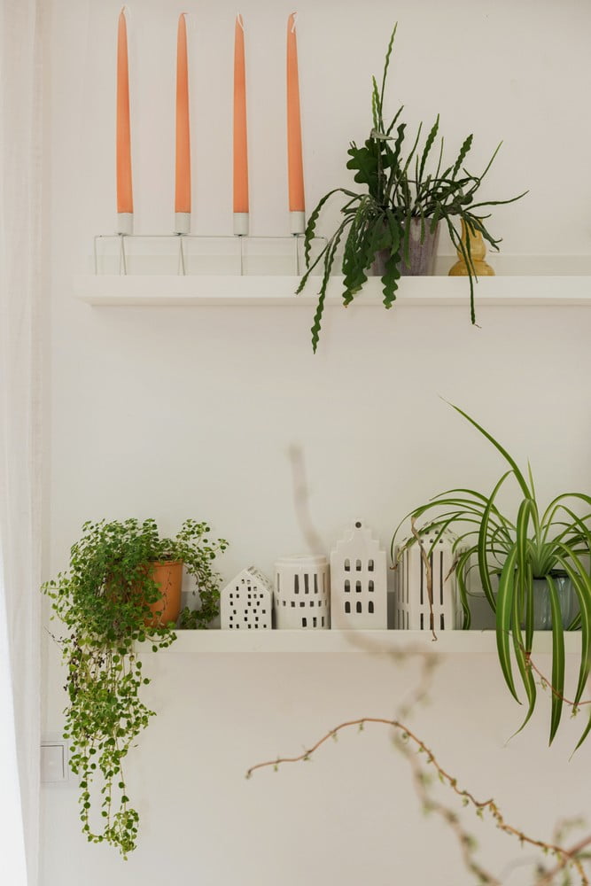 Az ötletes részletek polcok és dekorációk formájában játékosságot visznek a szobába.