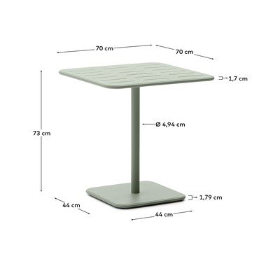 A Kave Home márka Brai acél kerti étkezőasztala praktikus és stílusos kiegészítő a belső térbe vagy a kertbe. Négyzet alakú, hosszanti barázdákkal ellátott lapja egy masszív központi lábon és stabil alapon nyugszik.