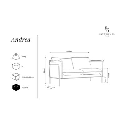 Szerezz be kényelmes és stílusos darabokat otthonodba! Az Andrea kanapé a Interieurs 86 termékcsaládból megragadja a tekinteteket színes megjelenésével, melynek fekete váza kiemeli modern designját. A kellemes felület 70% poliészterből újrahasznosított PET-palackokból, valamint a foltok tisztítását megkönnyítő technológiával készült.