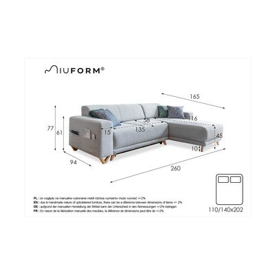 Classy Sophie sarokkanapéKinyitható-tárolóhelyes, jobb oldali-bal oldali-variálható sarok-heverő résszel, antracitszürke, háromszemélyes, szélesség 260 cm, mélység 165 cm, ülésmélység 58 cm