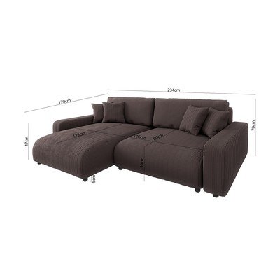 Kordbársony, kinyitható-tárolóhelyes, jobb oldali-bal oldali-variálható sarok-heverő résszel, barna, háromszemélyes, szélesség 234 cm