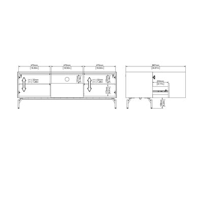 Két állítható polccal ellátott szekrénnyel és egy fiókkal rendelkezik. A nyitott középső rész könnyű hozzáférést biztosít a berendezésekhez, a kábelrendező pedig mindent rendezetten tart. Fémlábainak és modern kialakításának köszönhetően minden belső térbe jól illik.
