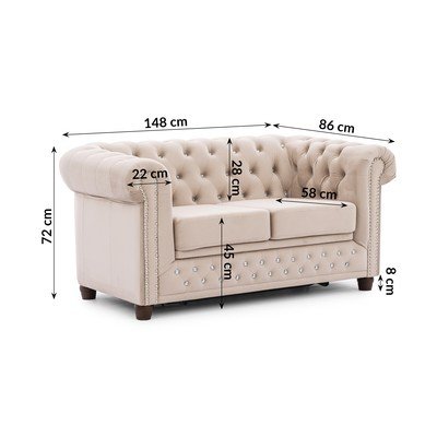 Bársony, kinyitható, chesterfield, bézs, vízlepergető-foltálló, kétszemélyes, szélesség 148 cm