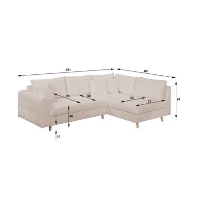 Buklé, jobb oldali-L alakú, bézs, háromszemélyes, szélesség 231 cm