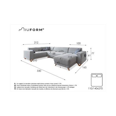 Kinyitható-tárolóhelyes, bal oldali-U alakú, bézs, öt- és többszemélyes, szélesség 330 cm, mélység 212 cm, ülésmélység 58 cm
