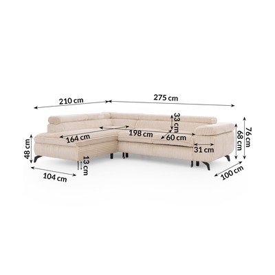Kordbársony, állítható-kinyitható-tárolóhelyes, bal oldali-L alakú, bézs, háziállatbarát-foltálló, négyszemélyes, szélesség 275 cm