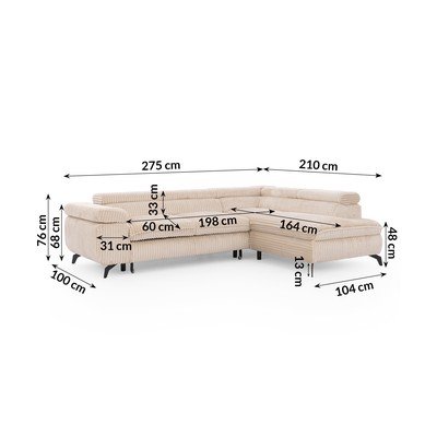 Kordbársony, állítható-kinyitható-tárolóhelyes, jobb oldali-L alakú, bézs, háziállatbarát-foltálló, négyszemélyes, szélesség 275 cm