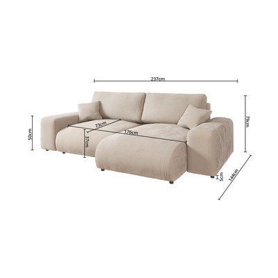 Kordbársony, jobb oldali-bal oldali-variálható sarok-heverő résszel, bézs, háromszemélyes, szélesség 237 cm