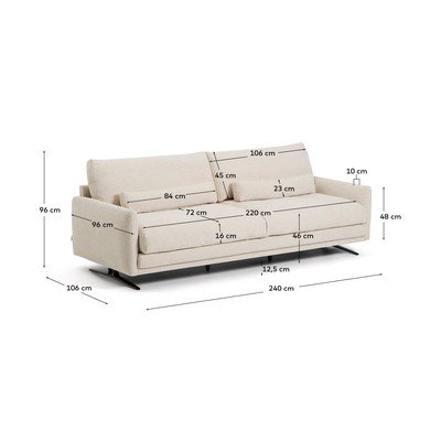 A belső szerkezet FSC Mix Credit tanúsítvánnyal rendelkező borovi fenyőből készült, ami garantálja a felelős forrásból származó anyagok felhasználását. Az elegáns matt, mikrotextúrájú porszórt bevonatú acéllábak stabilitást és modern megjelenést kölcsönöznek a kanapénak. A kanapé Spanyolországban készült, és kiegyensúlyozott dizájnjának, valamint magas szintű kényelmének köszönhetően könnyen alkalmazkodik a különböző lakberendezési stílusokhoz.
