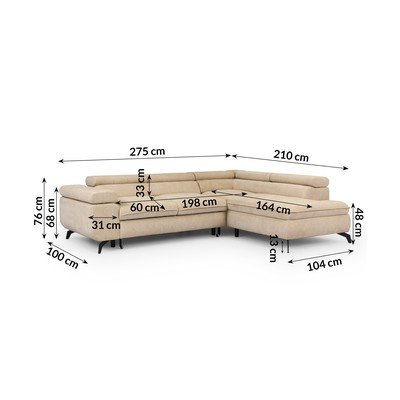 Zsenília, állítható-kinyitható-tárolóhelyes, jobb oldali-L alakú, bézs, háziállatbarát-foltálló, négyszemélyes, szélesség 275 cm