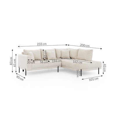 Zsenília, jobb oldali-L alakú, bézs, háziállatbarát-foltálló, négyszemélyes, szélesség 233 cm