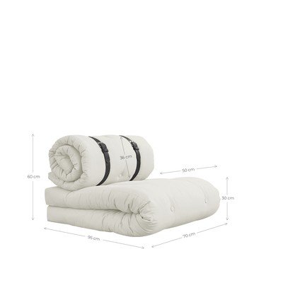 Kisebb méretű a lakás, és kényelmes ülőhelyre és alkalmi alvóhelyre is szükséged lenne? Nem áthidalhatatlan a probléma! A Karup Design Buckle Up kinyitható fotelével könnyedén megoldhatod a helyhiány problémáját! Ez a darab két bútort rejt egyben! Pár pillanat alatt a kényelmes fotelből egyszemélyes ágyat varázsolhatsz. A Buckle Up két matracból áll, a felsőt két bőrszíj rögzíti az alsóhoz. A fotel megalkotásakor az ősi hagyományos japán életmódból merítettek ihletet a tervezők.