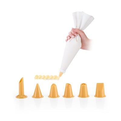 Ideális eszköz a desszertek díszítéséhez és megtöltéséhez. Kiváló minőségű, szivárgásmentes pamutvászonból és tartós műanyagból készült. Az első használat előtt és minden használat után a zsákot és a díszítőfejeket is folyó víz alatt mosd ki. A fejek mosogatógépben moshatók.