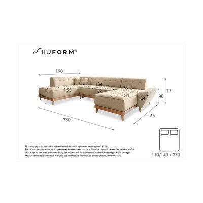 Kinyitható-tárolóhelyesBal oldali-U alakúBézsÖt- és többszemélyesSzélesség 330 cmMélység 190 cmÜlésmélység 62 cm