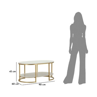 A Mauro Ferretti márka Izmir dohányzóasztala elegáns kiegészítője a nappalinak. Ovális formájú, és két tárolóhelyet kínál, amelyek dekorációk, könyvek vagy egy csésze kávé elhelyezésére is ideálisak. A polcok közötti távolság 28,5 cm.
