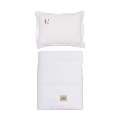 Ez a dekoratív hímzéssel ellátott aranyos babaágynemű szett tökéletesen kiegészít minden szobát. ÖkoTex 100 tanúsítvánnyal rendelkező, puha, mosott pamutból készült, amely szerkezetében a lenre hasonlít. Töltete antiallergén szilikonból áll.