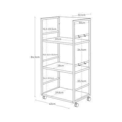 Két polc magassága állítható, ami rugalmasságot biztosít az elrendezésben. Az egyszerű mozgatás érdekében a hátlapnál egy fogantyú található, és az állványhoz négy praktikus kampó is tartozik.
