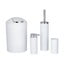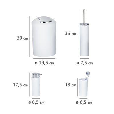 A készletben egy fogkefetartó pohár, egy szappanadagoló, egy 6,5 literes szemetes és egy 6,5 cm széles, cserélhető fejes WC-kefe található. A kefe rugalmas műanyag sörtékkel rendelkezik, amelyek hatékonyan tisztítanak és nem karcolják meg a WC-csészét.
