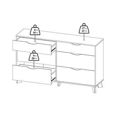 A fiókok fehér színű eleje kontrasztot alkot a konstrukció természetes tölgyfa kivitelével, és modern, kifinomult megjelenést teremt. Fogantyúk helyett praktikus kivágások találhatók rajta.