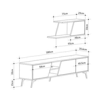 Ez a nappali bútor szett egy 180 x 48 x 35,6 cm-es TV-állványból és egy 95 x 33 x 25 cm-es fali polcból áll.