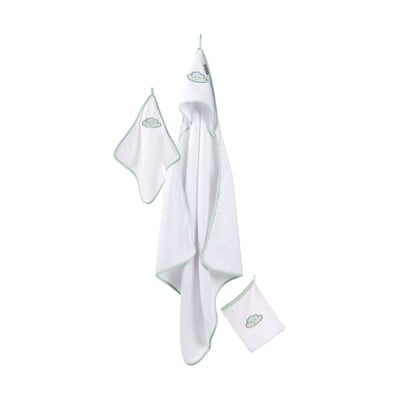 Minden darab kiváló minőségű és bőrbarát frottírpamutból készült. A kapucnis törölköző egyszerre praktikus és aranyos, a felhő motívum pedig játékos megjelenést kölcsönöz az egész szettnek.