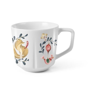 Rosendahl bögre Fam Irvoll norvég illusztrátorral együttműködésben készült. A minimalista fehér Grand Cru termék játékos és fantáziadús illusztrációt kapott, ami gallyakat, leveleket, bogyókat, magyalt, madarakat, mézeskalács szíveket és üvegdíszeket ötvöz egy harmonikus egésszé.
