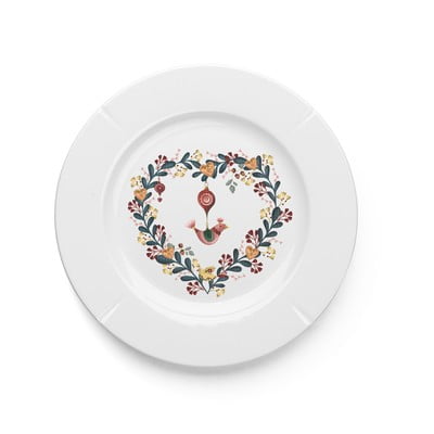 Rosendahl tányér Fam Irvoll norvég illusztrátorral együttműködésben készült. A minimalista fehér Grand Cru termék játékos és fantáziadús illusztrációt kapott, ami gallyakat, leveleket, bogyókat, magyalt, madarakat, mézeskalács szíveket és üvegdíszeket ötvöz egy harmonikus egésszé.