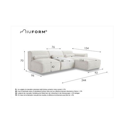 Jobb oldali-heverő résszelKrémszínűHáromszemélyesSzélesség 244 cmMélység 154 cmÜlésmélység 58 cm