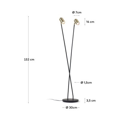 A Kave Home márla Clemence állólámpája fekete fémszerkezetének és két sárgaréz búrájának elegáns kontrasztjával nyűgöz le. A lámpa 152 cm magas, és két állítható búrával van felszerelve, amelyek lehetővé teszik, hogy a fényt igény szerint irányítsd. A lámpa E27-es, maximum 3 W teljesítményű LED izzókkal kompatibilis.
