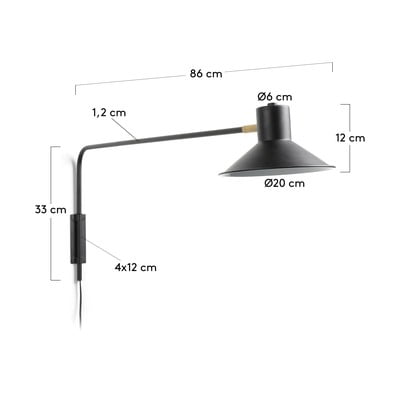 A Kave Home márka Aria fali lámpája fekete lakkozott acélból készült. Rugalmas szárral rendelkezik, amely megkönnyíti a fény irányítását oda, ahová szükséges. j A lámpa E14-es izzóval kompatibilis, amelynek maximális teljesítménye 25 W. Az izzó nem tartozék.