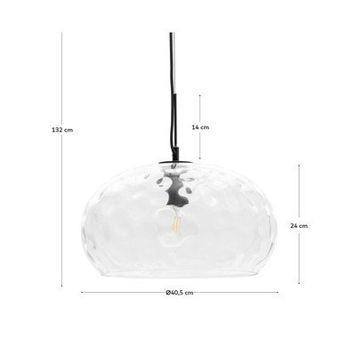 A Kave Home márka Balma függőlámpája egyszerű, de elegáns kialakításával nyűgöz le. A 40 cm átmérőjű búra átlátszó üvegből készült, melynek textúrázott felülete érdekes fényhatásokat kelt. A lámpa E27-es izzóval kompatibilis, amelynek maximális teljesítménye 40 W. Az izzó nem tartozék.