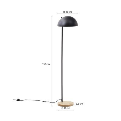 A Kave Home márka Catlar állólámpája fémből készült, fekete színű kivitelben. A lámpa félkör alakú búrával rendelkezik, és egyszerű kőrisfa talapzaton áll. E27-es izzóval kompatibilis, amelynek maximális teljesítménye 40 W. Az izzó nem tartozék.