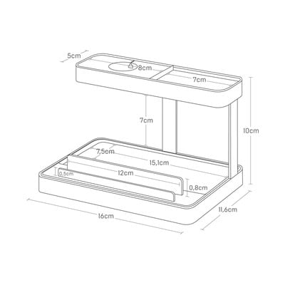 A Yamazaki praktikus állványa lehetővé teszi, hogy minden készülékét egy helyen tárolj és tölts. A tetején egy kábelnyílás található, és egy szilikon alátét az okosóra számára. Az alján telefontartó van, és egyéb apróságoknak is van hely.