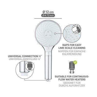 A beépített WaterSaving szabályozónak köszönhetően az áramlási sebesség mindössze 9 liter/percre állítható, ami legalább 35%-os megtakarítást jelent a hagyományos zuhanyfejekhez képest. Ez a 12 cm átmérőjű zuhanyfej nemcsak fürdőszobád megjelenését dobja fel, hanem a víz- és energiatakarékosság révén a környezet védelmét is segíti.