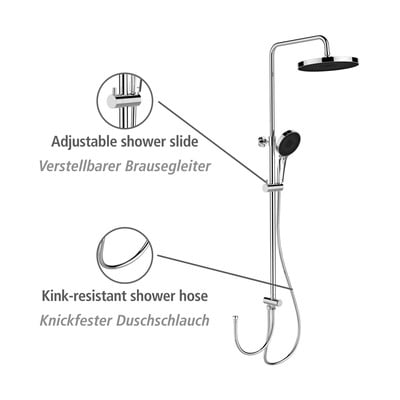 A széles fej összesen 416 beépített fúvókával van felszerelve, amelyek finoman permetezik a vizet a bőrre. A kézi zuhanyfej 324 fúvókával összesen 3 vízsugár funkciót kínál - széles vizsugár, masszázs és intenzív beállítások. Ezt egy 150 cm hosszú tömlő egészíti ki, amely ellenáll a csavarodásnak és a gyűrődésnek.