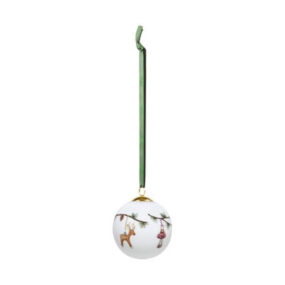 A porcelán díszt a kollekcióra jellemző motívum díszíti - egy fenyőág fenyőtobozokkal, amelyen karácsonyi díszek lógnak. A zöld selyemszalagnak köszönhetően könnyen felakasztható a fára és egy vázában lévő ágra is.