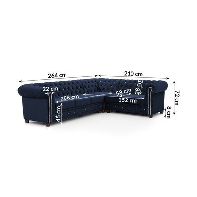 Bársony, kinyitható, chesterfield, jobb oldali-L alakú, kék, vízlepergető-foltálló, négyszemélyes, szélesség 264 cm