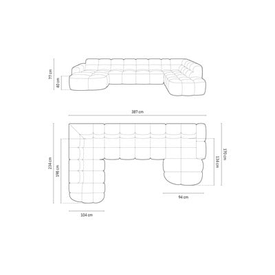Bal oldali-U alakú, kék, öt- és többszemélyes, szélesség 387 cm, mélység 234 cm, ülésmélység 58 cm
