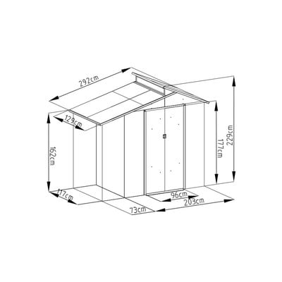 A 96 x 177 cm-es dupla tolóajtók kényelmes hozzáférést biztosítanak a tárolt tárgyakhoz. A ház minőségi tűzihorganyzott acéllemezekből készült, 0,25-0,30 mm vastagságban, szellőzőrácsokkal. A lemezeket egy 0,5 - 0,8 mm vastag horganyzott acélkeret és egy kerületi keret tartja össze, amit a mellékelt horgonycsavarok segítségével sík alapra (beton, csempe, fapadló...) kell rögzíteni.