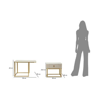A nagyobbik asztal márványdekoros asztallappal rendelkezik, és 70 x 70 x 48 cm-es. A kisebbik asztal 50 x 50 x 43,5 cm-es, praktikus fiókkal rendelkezik, amely ideális az apró tárgyak tárolására. A fiók belső méretei 26 x 28 x 7 cm. Mindkét bútordarab masszív fémszerkezeten áll.