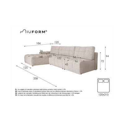 Kinyitható-tárolóhelyesBal oldaliKrémszínűHáromszemélyesSzélesség 338 cmMélység 184 cmÜlésmélység 56 cm